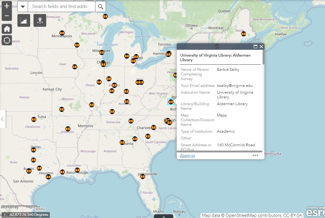 So, fellow CRD members, here is your chance to “join the club” as it were! To add your map collection’s information into the directory go to: https://www.arcgis.com/apps/webappviewer/index.html?id=87e0701cfadf44758917724cf43605b4&extent=-14695398.5106%2C2508383.194%2C-7063925.6066%2C7483516.491%2C102100 and you will find a map of North America scattered with icons of the locations of map collections currently established in the database. (if you click on one, information about the collection pops up) Look at the left Info Bar and note the “Take the Survey to Get on the Map!” sentence as there is a link there to a survey tool. Please note that the survey is 2-part, the first part is short and focused on contact information including an easy-to-use “Location” finder, but if you want to also let the world know how many maps you have, the subject strengths in the collection and so on continue on to the second part where indicated at the bottom. It’s your choice.