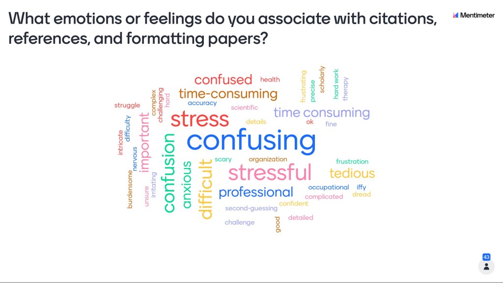 This past year I incorporated something very simple into my instructional sessions, a question asked at the start of class: How do you feel about research and research papers? I posed this question (or some form it) using the internet anonymous polling tool Mentimeter, which allows for quick, easy, and visible participation. Predictably, the answers to this question consistently spoke to student anxiety: including such words as dread, pain, and struggle, and always prominently displaying the words overwhelming and stress/stressed/stressful.