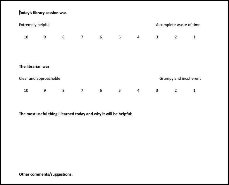 Around 2009, I began to hand out printed half-sheets of paper with Likert scales for students to rate their satisfaction with the session, plus a prompt for a “one-minute paper” about how they expected to use the knowledge they had gained. I would go through the papers after every class session and transcribe and code the results. It was time-consuming (and sometimes humbling) work, but it gave me a good sense of what the students had to say about our research instruction and how it could be improved. This method also gave us some basic quantitative data to present to the administration.